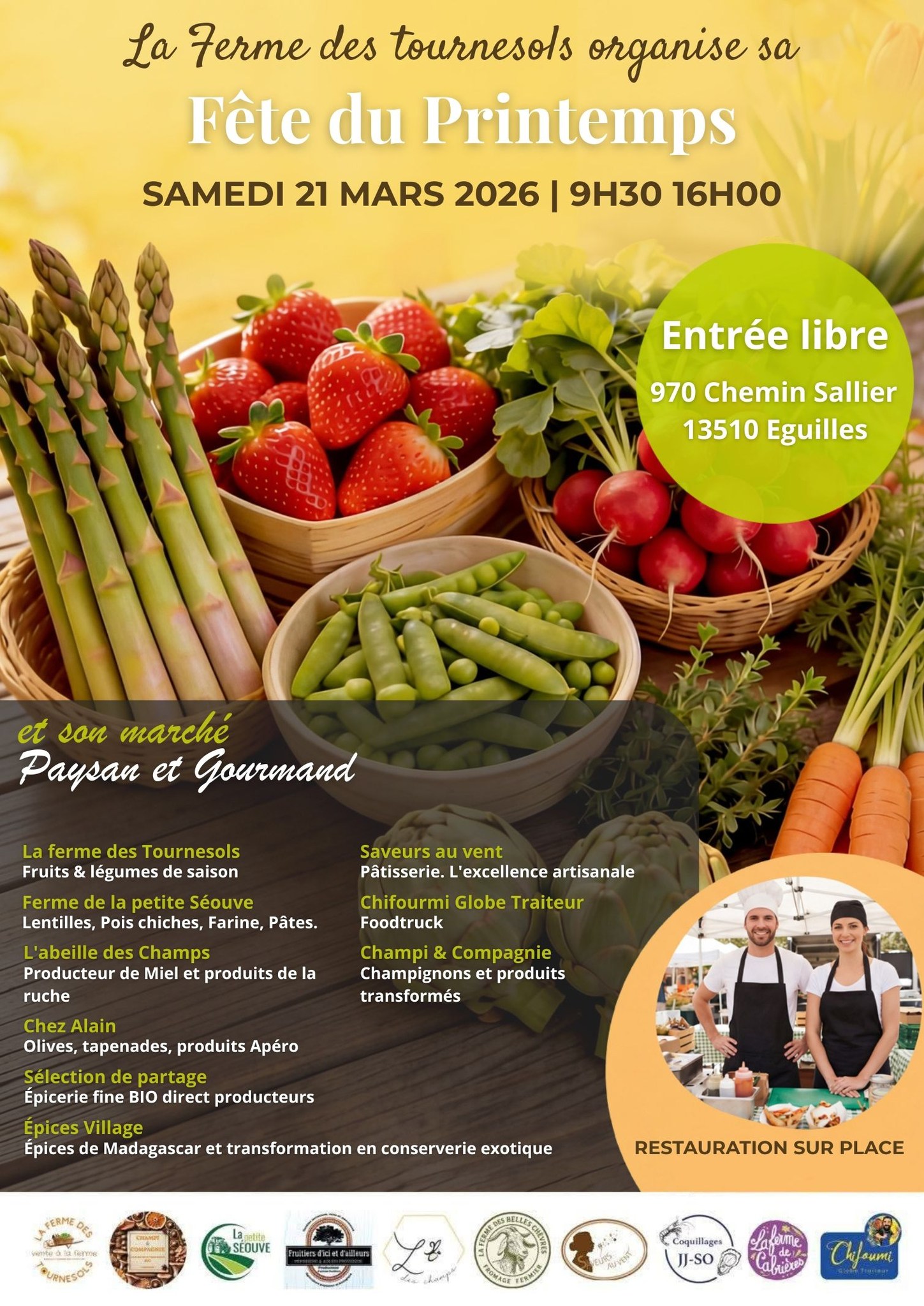 Mis en avant 9:30 am - 4:00 pm La Fête du Printemps à la Ferme des Tournesols, Eguilles Mis en avant mars 21 @ 9:30 am - 4:00 pm La Fête du Printemps à la Ferme des Tournesols, Eguilles Un RDV printanier à La Ferme des Tournesols à Eguilles avec des producteurs, des artisans du bien manger ! De quoi se régaler autour de belles rencontres. Notre association tiendra son stand pour expliquer notre projet.